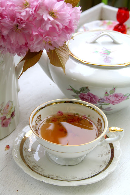 BeantwoordenVerwijderenIt would be wonderful to sit there and take in all the beauty of your romantic haven. I love that cherry tree,I planted one here but it died the first year-sadly.Your china is pretty too.